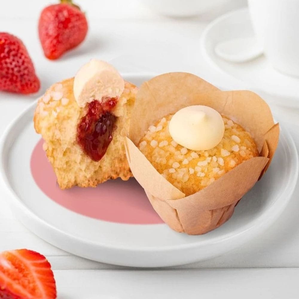 Wheat flour (WHEAT) (Wheat flour (WHEAT); Calcium carbonate; Niacin; Iron; Thiamine); Sugar; Rapeseed oil; Water; Strawberry jam (9,0%) (Sugar; Strawberry puree; Glucose Fructose syrup; Acid: Citric acid; Acidity regulator: Sodiumcitrates; Gelling agent: Pectins); Whole egg powder (EGG); Sugar Nibs (3,6%); Butter ( MILK); Humectant: Glycerol; Modified starch; Clotted cream ( MILK) (1,5%); Emulsifier: Polyglycerol esters of fatty acids, Sodium stearoyl-2- lactylate, Mono- and diglycerides of fatty acids; Raising agent: Diphosphates, Sodium carbonates, Calcium phosphates; Palm oil; Dried egg white (EGG); Flavourings.
