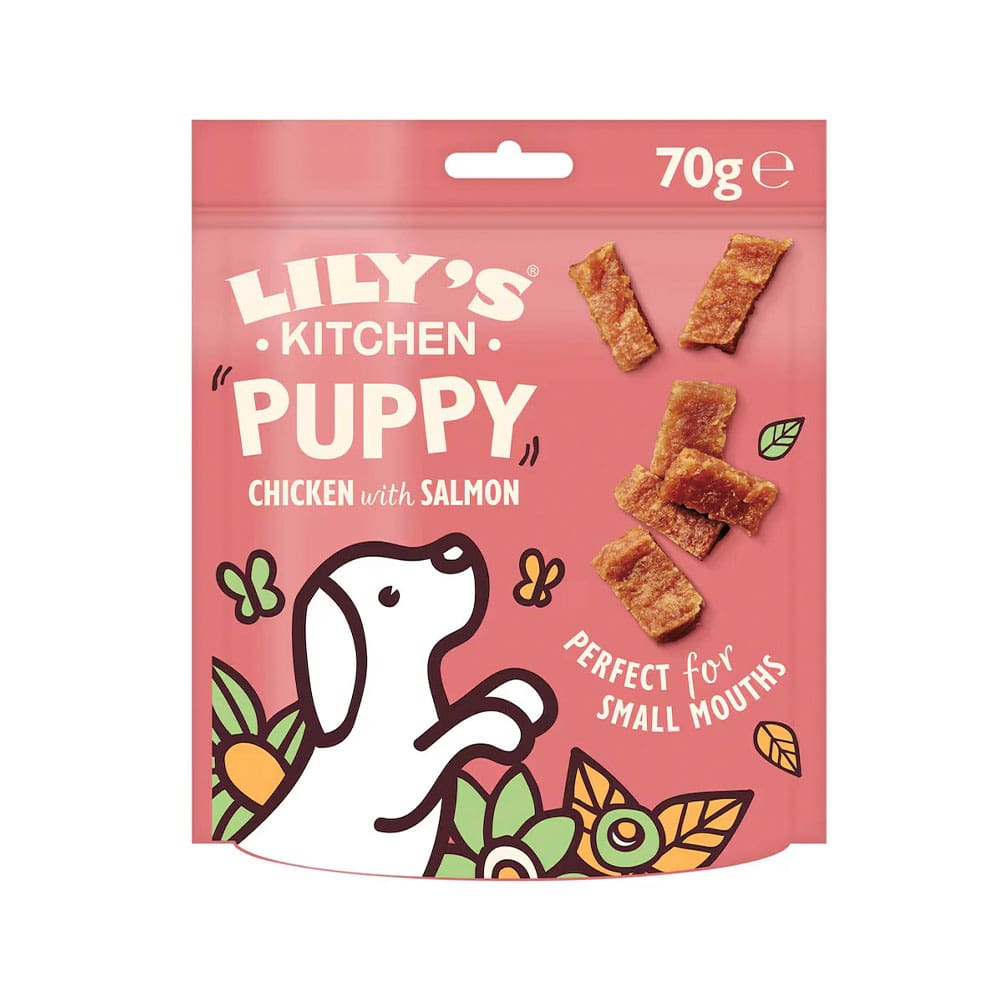 Lily’s Kitchen Puppy Chicken and Salmon Nibbles offer nutritious, tasty treats for puppies. Convenient 8x70g packs ideal for rewarding or training pups.