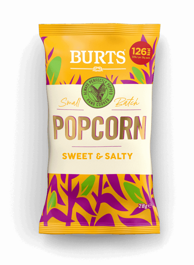 Burts Sweet and Salty Popcorn in 24x28g packs combines sweet caramel with a salty twist. Ideal for premium snacking solutions requiring flavour and quality.