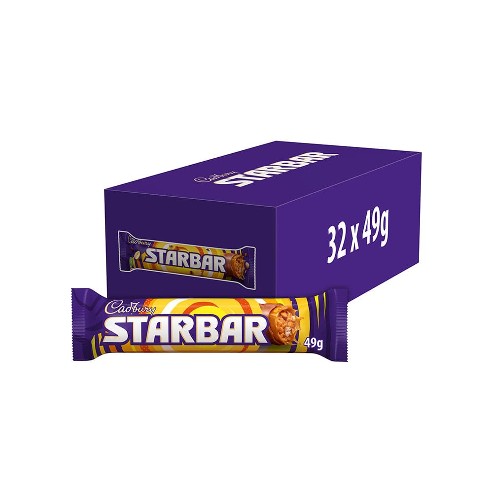 Cadbury Star Bar features chewy caramel, crushed roasted peanuts, and smooth milk chocolate. Ideal for a delightful snack in 32x49g packs.