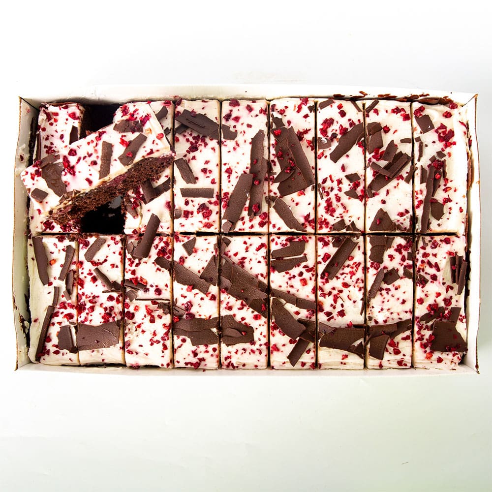 WHEAT flour (WHEAT flour, calcium carbonate, iron, niacin, folic acid, thiamin), SOYA drink (water, SOYA beans, sugar, natural flavouring, stabiliser (gellan gum)), soft light brown sugar (sugar, cane molasses), icing sugar, apple puree (apple puree, antioxidant (ascorbic acid)), rapeseed oil, sour cherries 7%, fat-reduced cocoa powder 4%, food preparation with coconut oil (water, coconut oil, potato starch, sea salt, acidity regulator (glucono-delta-lactone), natural flavourings, olive extract, vitamin B12), vegetable fat (shea butter, water, coconut oil, rapeseed oil, salt, carrot juice, emulsifier (lecithins (rapeseed, sunflower)), lemon juice, natural flavouring), dark chocolate shavings (sugar, cocoa mass, cocoa butter, emulsifier (SOYA lecithin), natural vanilla flavouring), ground flaxseed, raising agents (diphosphates, sodium carbonates), freeze dried sour cherry crumb, salt, Madagascan vanilla powder.