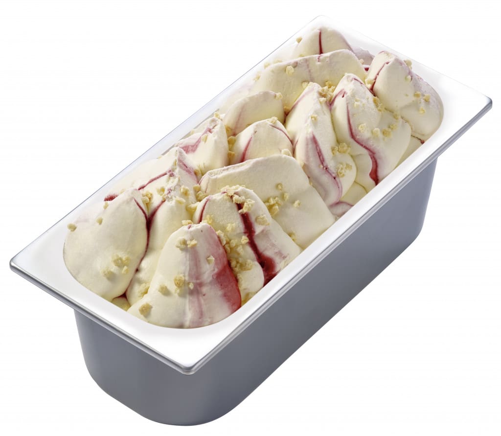 Carte D'Or Strawberry Cheesecake ice cream dessert blends smooth cheesecake, crunchy biscuit pieces and strawberry sauce for a rich frozen treat in 5.5L tubs.