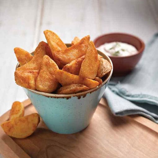 Chefs' Selections Seasoned Wedges offer crispy, flavourful potato shapes perfect for snacks or sides. Suitable for frying or baking, available in 4x2.27kg packs.