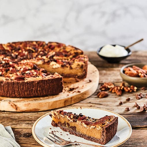 Pecan Pie Filling (59%) (Brown Sugar, Margarine (Vegetable Oils (Palm, Rapeseed), Water, Flavouring), Invert Sugar Syrup, Coconut Milk (Coconut Extract, Water), Wheat Flour (WHEAT Flour, Calcium Carbonate, Niacin, Iron, Thiamin), Vegan Chocolate Chips (9%) (Cocoa Mass, Sugar, Cocoa Butter, Fat Reduced Cocoa Powder, Emulsifier (SOYA Lecithins)), Water, Golden Flaxseed, Modified Waxy Maize Starch, Salt, Modified Potato Starch, Natural Flavourings, Thickener (Guar Gum)), Chocolate Crumb Pastry (Wheat Flour (WHEAT Flour, Calcium Carbonate, Niacin, Iron, Thiamin), Bourbon Biscuit Crumb (Wheat Flour (WHEAT Flour, Calcium Carbonate, Iron, Niacin, Thiamin), Vegetable Oils (Palm, Rapeseed), Sugar, Cocoa Powder, Inverted Sugar Syrup, Raising Agent (Sodium Hydrogen Carbonate), Salt), Margarine (Vegetable Oils (Palm, Rapeseed), Water, Flavouring), Water, Sugar, Fat Reduced Alkalised Cocoa Powder, Flour Treatment Agent (L- Cysteine)), Toasted PECAN NUT Halves (9%), Vegan Chocolate Chips (5%) (Cocoa Mass, Sugar, Cocoa Butter, Fat Reduced Cocoa Powder, Emulsifier (SOYA Lecithins)).