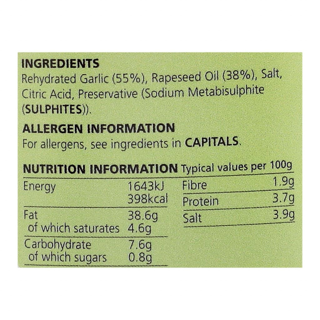 Rehydrated Garlic (55%), Rapeseed Oil (38%) , Salt, Acidity Regulator (Citric Acid), Preservative (Sodium Metabisulphite (SULPHITES)).