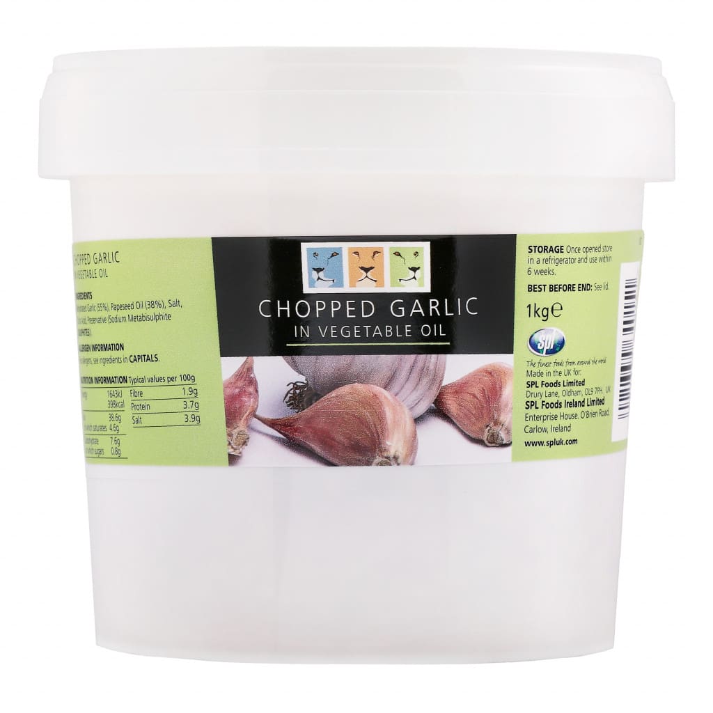Chopped garlic in oil, gluten-free with a neutral aroma and flavour. Perfect for sauces and marinades, supplied in a convenient 1kg pack.