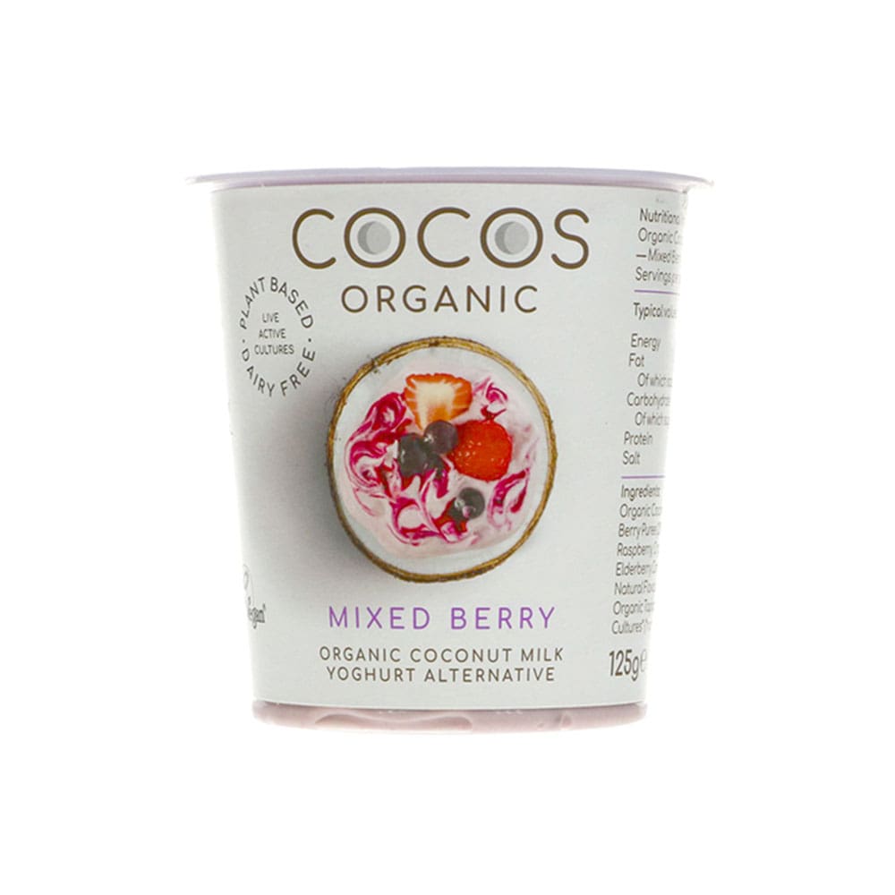 Organic Coconut Milk (74%) (Organic Coconut/Filtered Water*), Organic Mixed Berry Puree (24%) (Organic Strawberry, Organic Raspberry, Organic Blackcurrant, Organic Elderberry Concentrate, Organic Fruit Extracts, Natural Flavourings* (Strawberry) Citric Acid*), Thickener: Organic Tapioca Starch, Live Vegan Cultures*, (*Non Organic Ingredients)