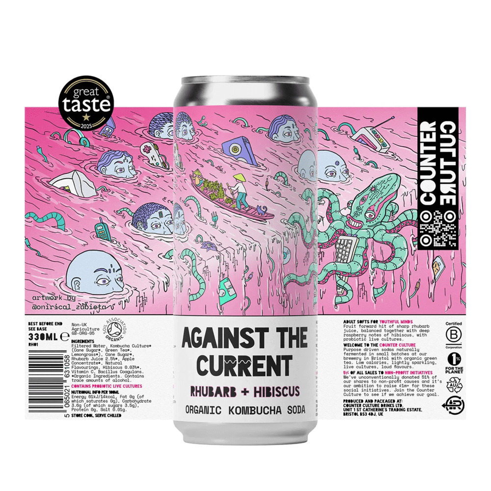 Filtered Water, Organic Kombucha Culture (Organic Cane Sugar, Organic Green Tea, Organic Lemongrass), Organic Cane Sugar, Organic Rhubarb Juice 2.5%, Organic Apple Concentrate, Natural Flavourings, Organic Hibiscus 0.03%, Vitamin C, Bacillus Coagulans.