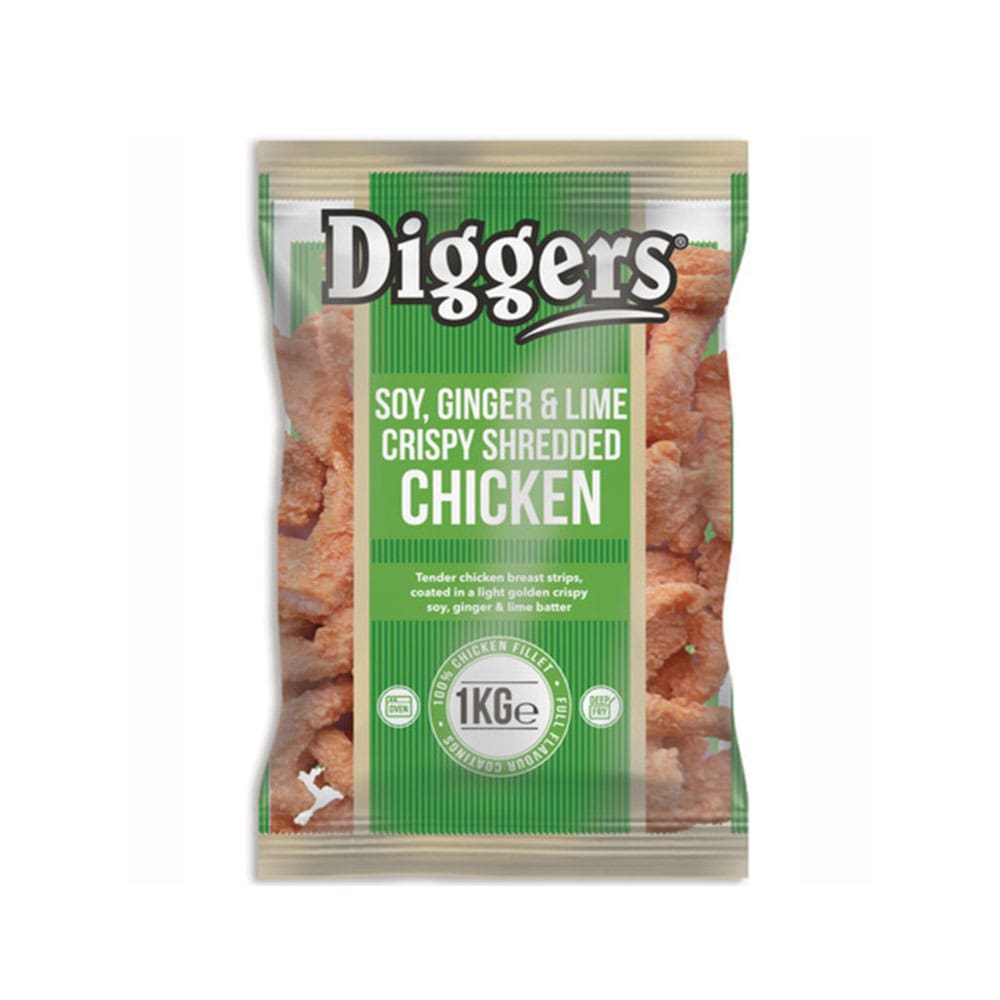Diggers Soy, Ginger and Lime Shredded Chicken offers a distinctive tangy flavour in convenient 1kg packs. Ideal for chefs seeking premium coated chicken to elevate dishes.