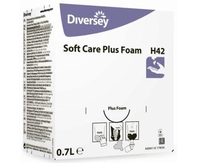 Diversey Soft Care Plus Foam H42 is an unperfumed antibacterial handwash ideal for food handling environments. Supplied in 6x700ml packs for use with Soft Care dispensers.
