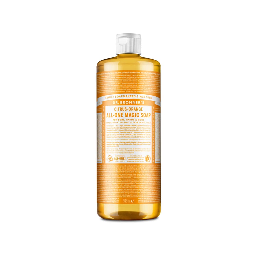 Dr Bronners Citrus All-One Magic Liquid Soap blends organic citrus oils for a fresh, effective and biodegradable clean. Ideal for body and home use in 945ml sized packaging.