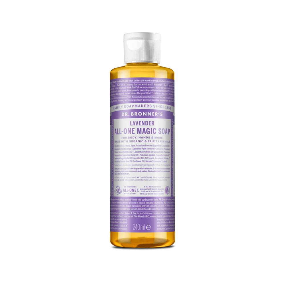 Dr Bronners Lavender Liquid Soap 240ml provides a soothing cleanse with pure lavender and lavandin oils. Versatile, biodegradable, ideal for daily use.