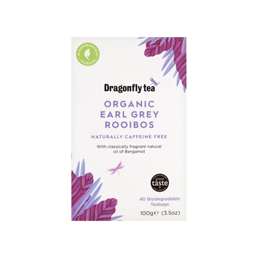 Dragonfly Organic Earl Grey Rooibos Tea offers an authentic, caffeine-free blend with Bergamot oil in 40 biodegradable teabags. Enjoy a refreshing cup anytime.