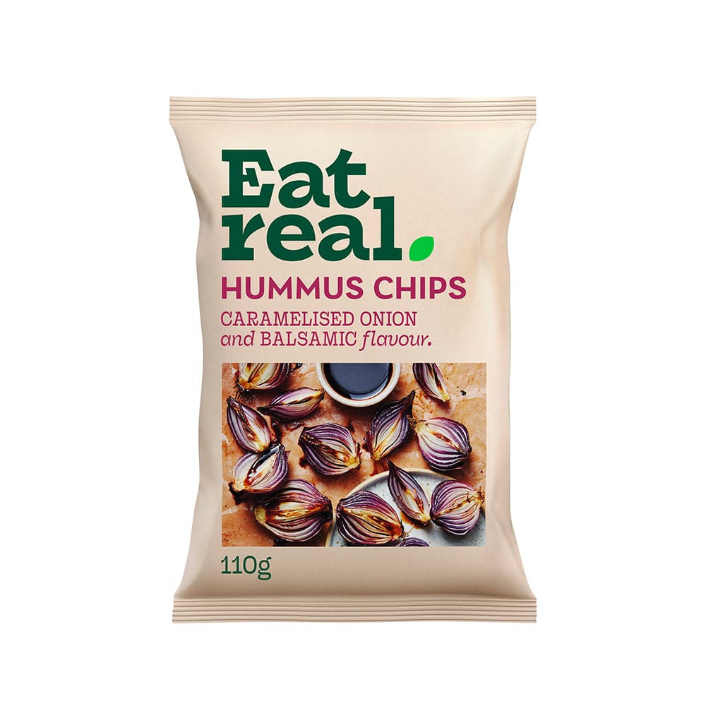Enjoy Eat Real Hummus Caramelised Onion crisps, a gluten-free, plant-based snack delivering rich, crunchy flavour. Supplied in convenient 10x110g packs.