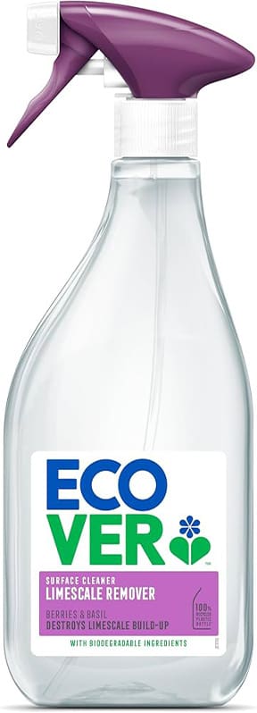 Ecover Limescale Remover Spray 500ml eliminates limescale on taps, tiles, and sinks, leaving surfaces spotless with a refreshing berries and basil fragrance.