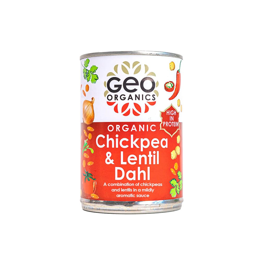 Geo Organics Chickpea & Lentil Dhal is an organic, vegan side dish in a 400g can, ideal for complementing authentic curry dishes with rice or naan.