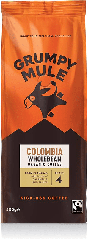 Grumpy Mule Organic Colombia Whole Beans offer a smooth, sweet flavour from the Andes. Ideal for freshly ground coffee in cafés, served black or with milk in 6x200g packs.