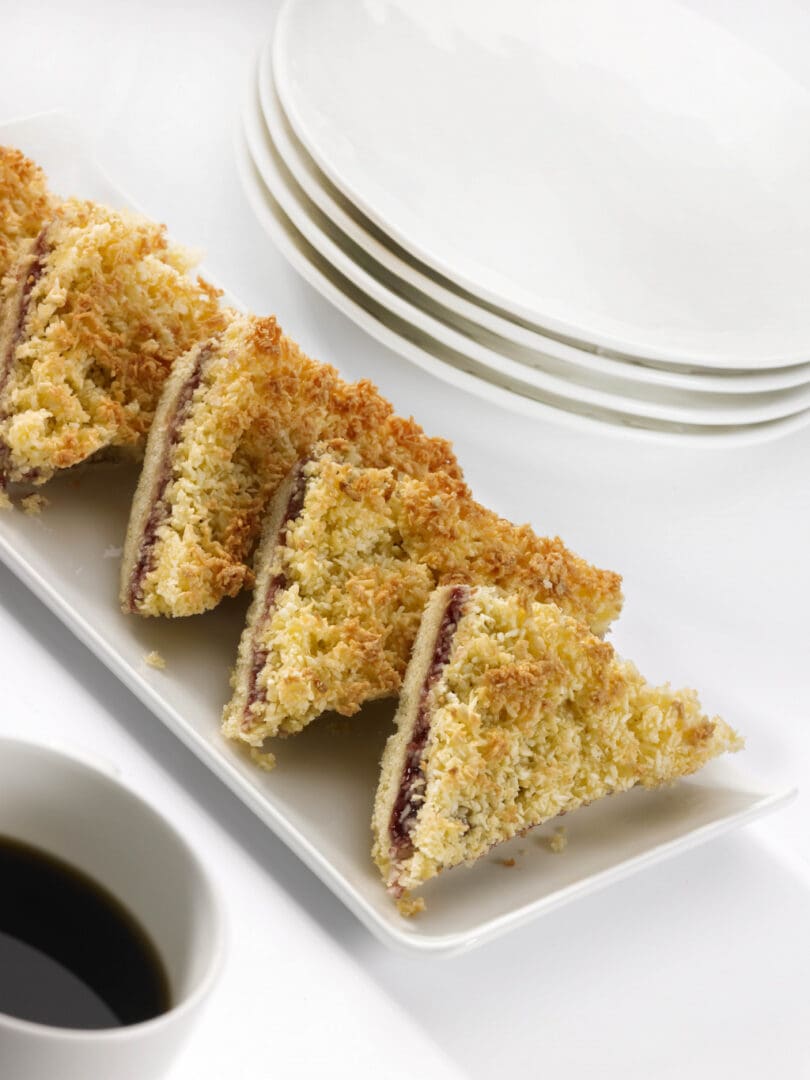 Handmade raspberry and coconut traybake cake with a shortcake base, raspberry jam, and toasted coconut topping. Ideal for cafés and catering menus.