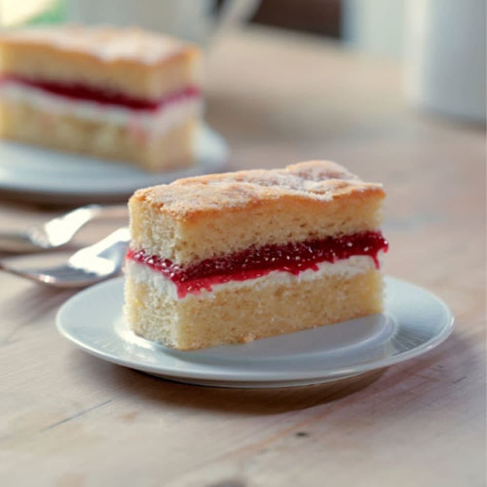 Light handmade Victoria Sponge Cake Traycake filled with icing and raspberry jam, sprinkled with sugar snow. Ideal for café and catering menus.