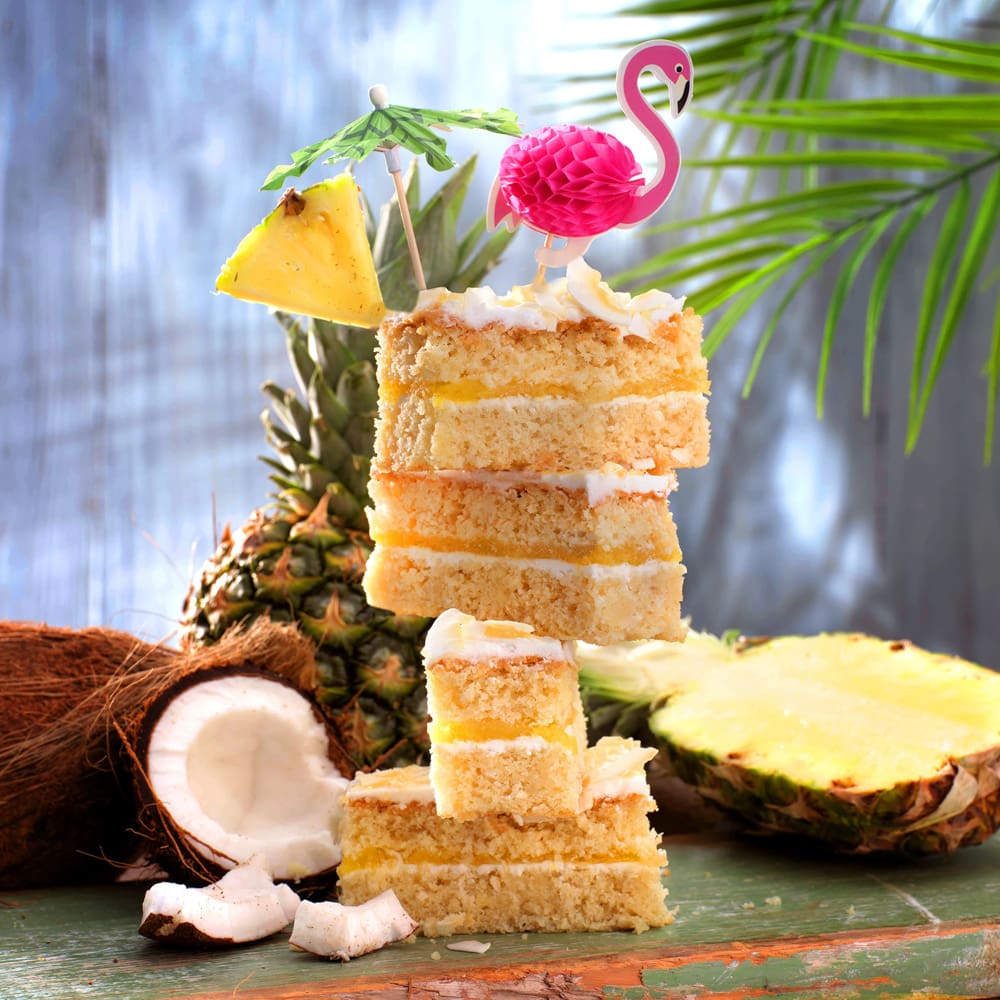 Sugar, Pasteurised Free Range EGG, Rapeseed Oil, WHEAT Flour (with Calcium Carbonate, Niacin, Iron, Thiamin), Pineapple Pieces (6%), Vegetable Margarine [Palm Oil, Rapeseed Oil, Water, Salt, Emulsifier (E471), Natural Flavouring], Water, Coconut Cream (2.7%) [Coconut, Water], Desiccated Coconut (2.2%), Lemon Sauce (1.9%) [Water, Sugar, Modified Maize Starch, Lemon Comminute, Vegetable Margarine [Shea Fat, Coconut Fat, Water], Lemon Crumb, Gelling Agents (Pectin, Agar), Acidity Regulators (Citric Acid, Trisodium Citrate), Concentrated Lemon Juice, Free Range EGG Powder, Natural Flavourings, Colour (Lutein), Lemon Oil], Toasted Desiccated Coconut (0.8%), Coconut Flavouring (0.7%), Baking Powder [Raising Agents (E575, E500(ii), E336(i)), Maize Starch], Modified Maize Starch, Concentrated Lemon Juice, Thickener (Pectin), Pineapple Flavouring (0.2%), Acid (Citric Acid), Natural Flavouring, Colour (Lutein).