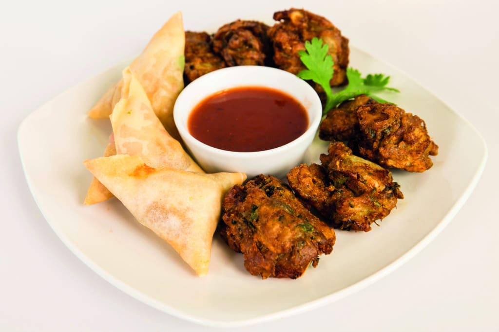 A classic Indian Snack Selection featuring Onion Bhajis, Spinach Pakora and Veg Samosa paired with tamarind sauce. Suitable for vegan and halal diets.