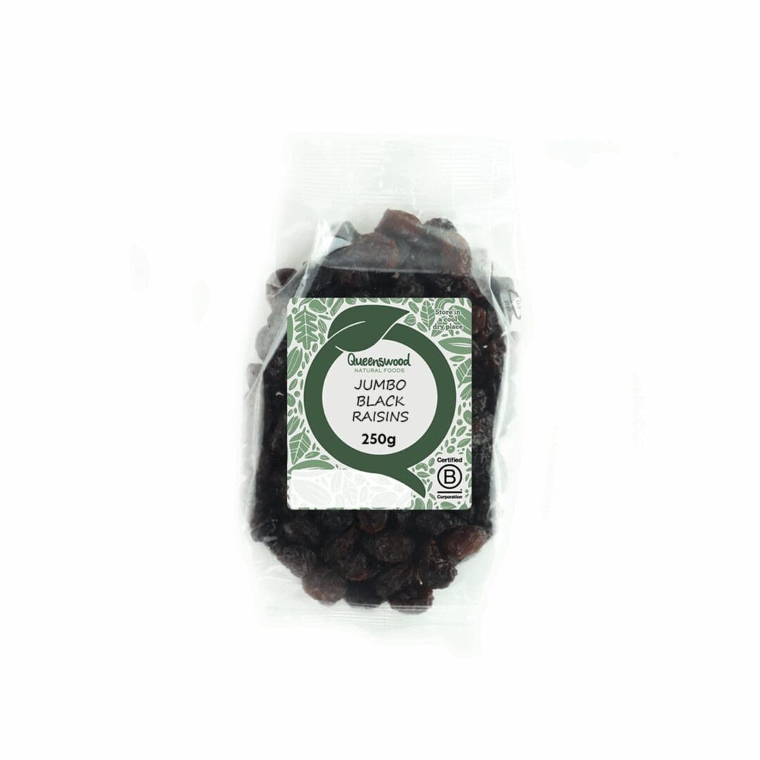 Jumbo Black Raisins in 5x250g packs, ideal for baking, cooking, or snacking. Premium dried fruits with rich flavour and perfect texture.