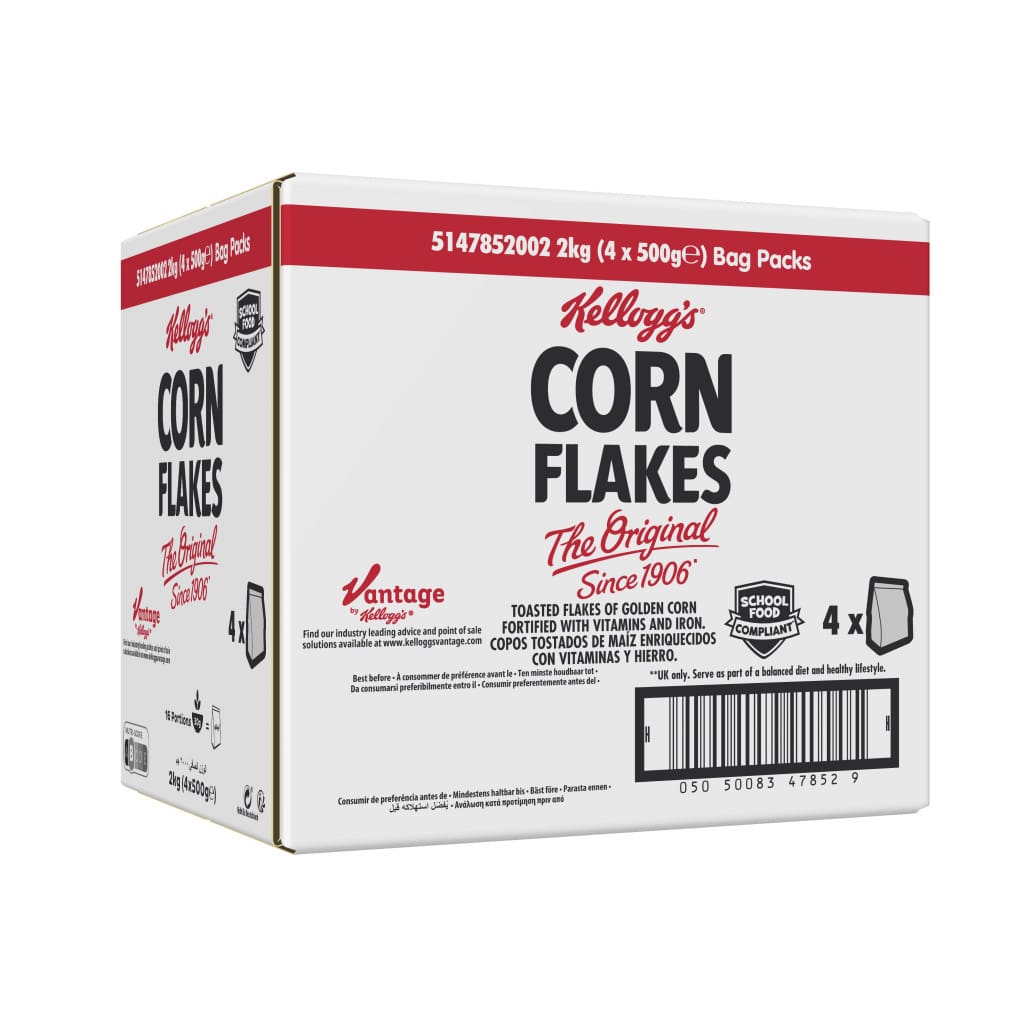 Kelloggs Corn Flakes 4x500g provide a crisp, classic cereal perfect for breakfast or a crunchy yoghurt topping. Enriched with essential vitamins for a nutritious start.