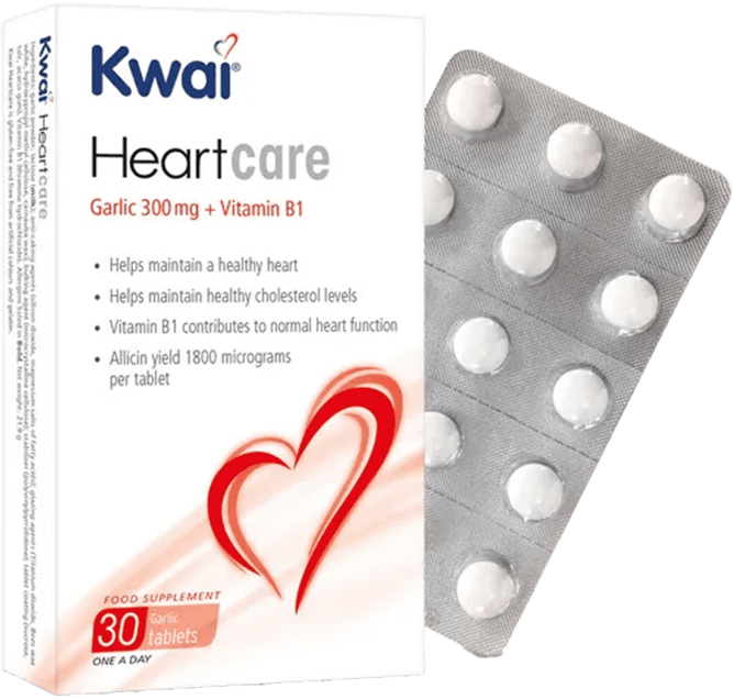 Kwai Heartcare supports cardiovascular health with one odour-free garlic tablet daily, containing 300mg garlic and vitamin B1 in 100 capsules.