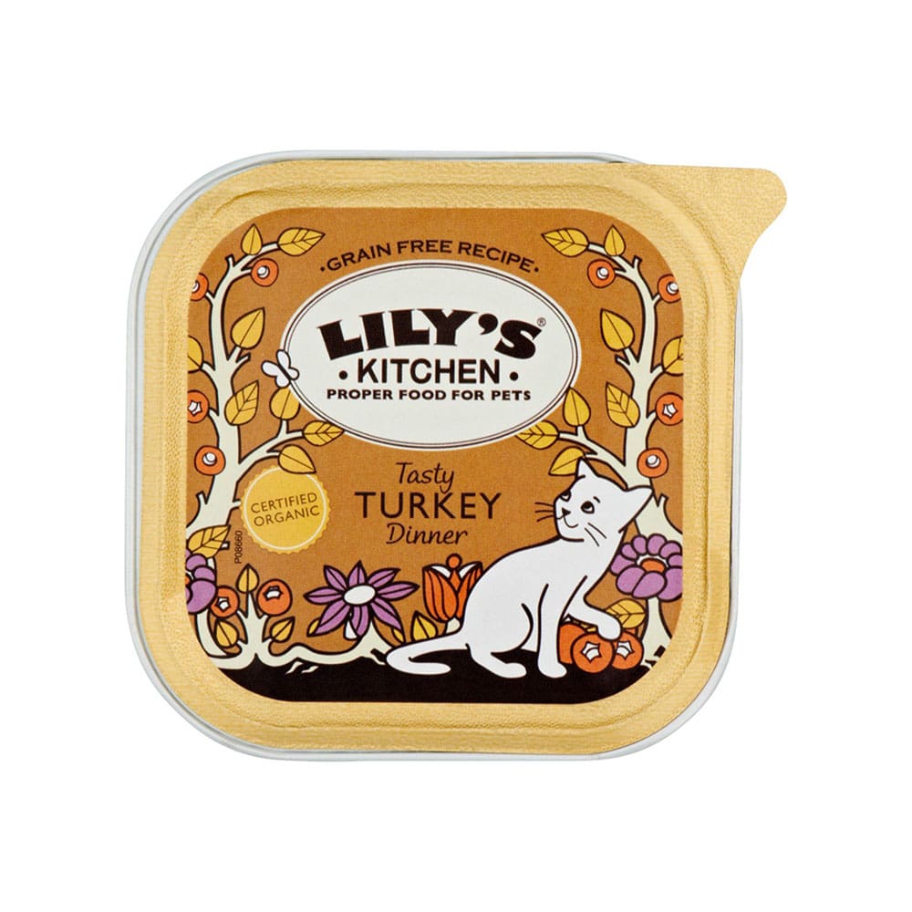 Lily's Kitchen Organic Turkey Cat Food Tray offers a smooth, lickable paté made with organic turkey, providing a wholesome, tasty meal in convenient 19x85g trays.