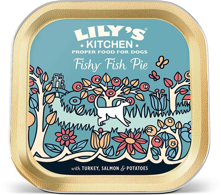 Lily's Kitchen Dog Fish Pie Tray provides a grain-free, nutritious dog food featuring salmon, herring, turkey and botanical herbs in a convenient 400g portion.
