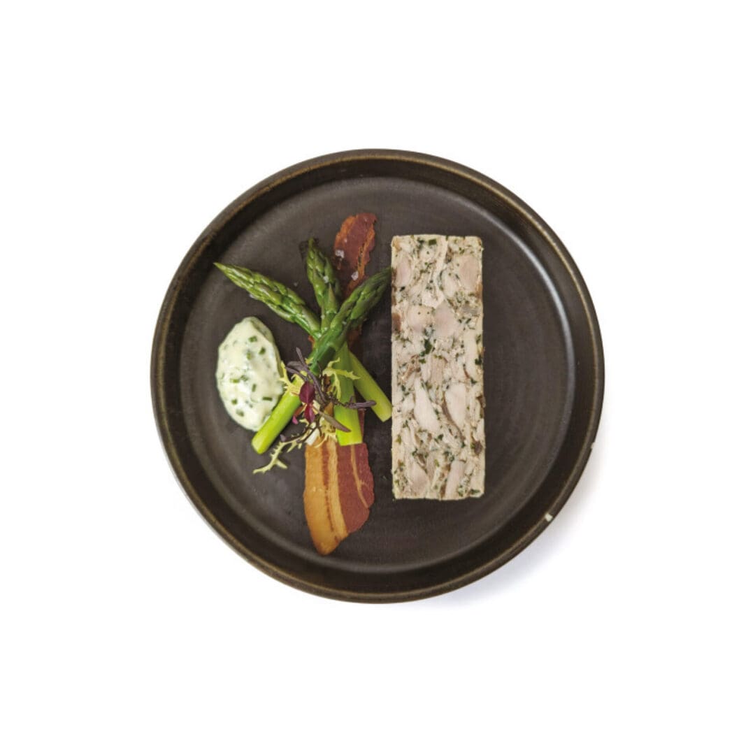 Chicken (82%), chicken stock, red onion relish [red onion (39%), sugar, balsamic vinegar (wine vinegar, grape must), kibbled onion, cornflour, onion powder, sunflower oil, acidity regulator (E330), lemon comminute, salt, cassia cinnamon, ground cloves], beef gelatine, salt, chives, parsley, tarragon.