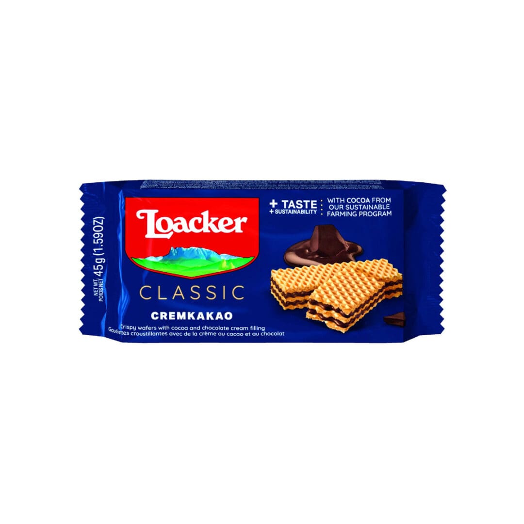 Loacker Cremkakao biscuits 25x45g feature a smooth cocoa cream filling encased in crisp wafers. Perfect for cafés and retail snack selections.