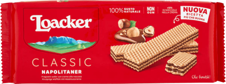 Loacker Napolitaner crispy wafer cubes filled with hazelnut cream, crafted using 100% Italian hazelnuts. Ideal for premium menus, available in 25x45g packs.