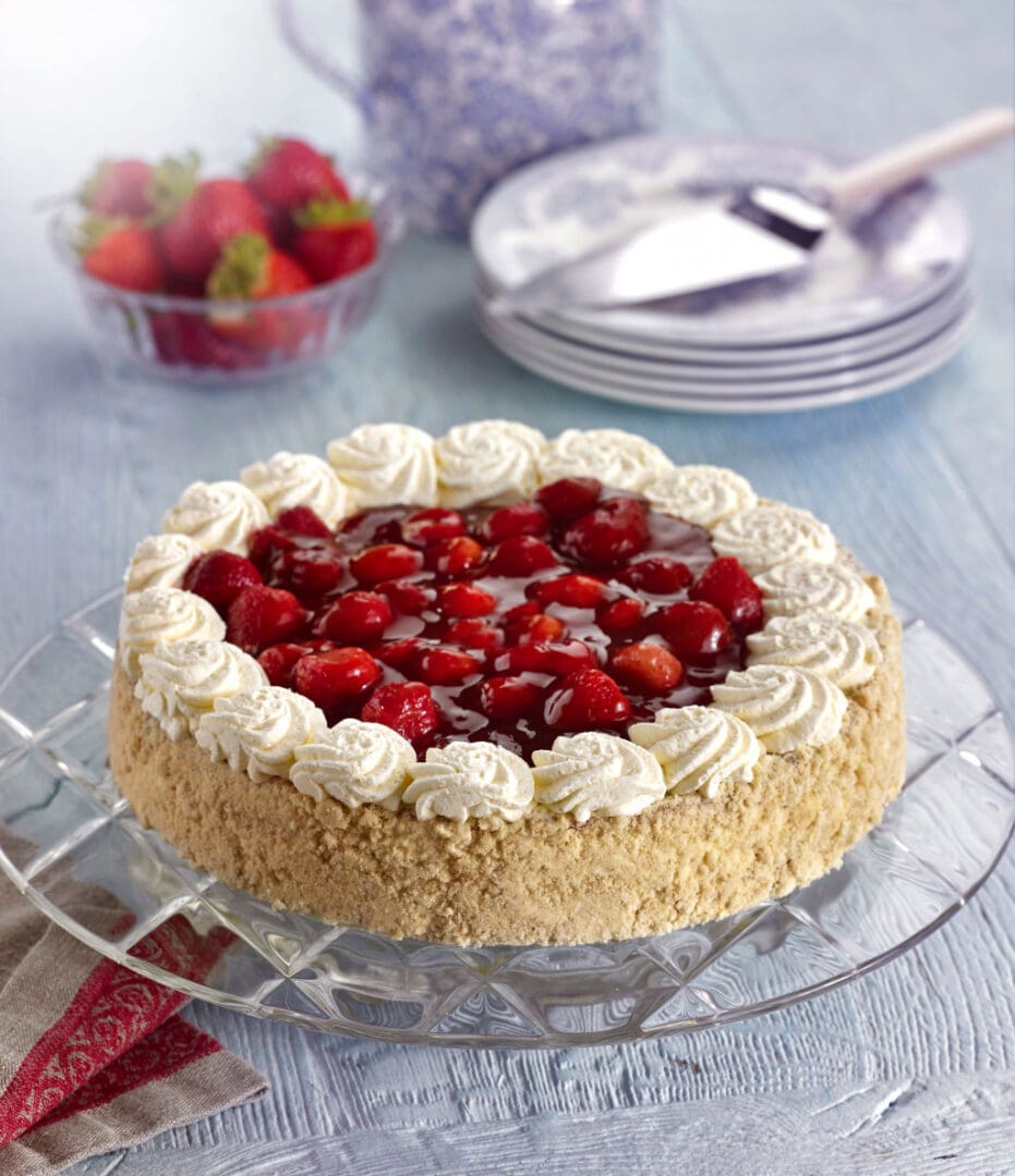 Mademoiselle Strawberry Gateau combines light vanilla sponge with creamy strawberry filling, topped with cream rosettes and fresh strawberries. Supplied in 18 portions.