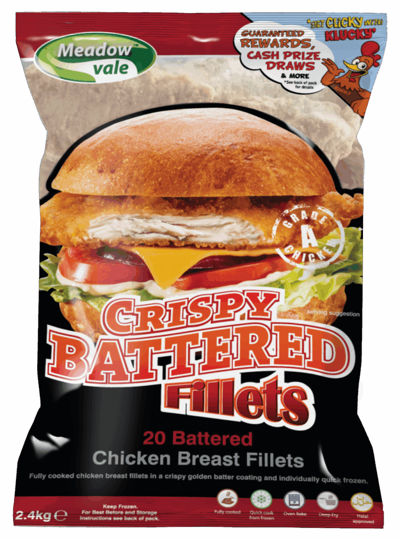 Meadowvale Battered Chicken Fillet 120g features fully cooked chicken breast fillets in a crispy batter, perfect for frying or baking, supplied in 1×2.4kg packs.