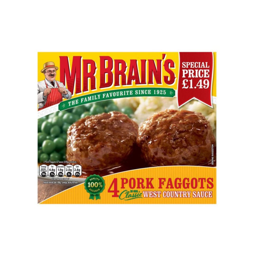 West Country Sauce (62%) contains: Water, Lard, Wheat Flour, Modified Cornflour, Tomato Puree, Salt, Colour: Caramel (E150c), Yeast Extract, Sugar, Onion Flavour, Spice and Herbs Extracts (Celery), Pork Faggots (38%) contains: Water, Rusk (Wheat), Rehydrated Pork Rind, Pork Liver (15%), Onion, Pork (4%), Wheat Flour, Salt, Sage, Spice Extracts