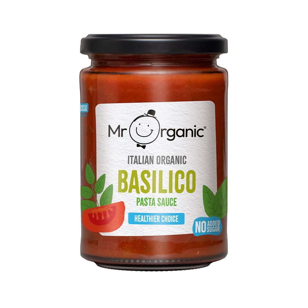 Mr Organic Basilico Pasta Sauce 350g combines fresh basil with ripe tomatoes in a ready-to-use sauce, perfect for authentic Italian dishes.