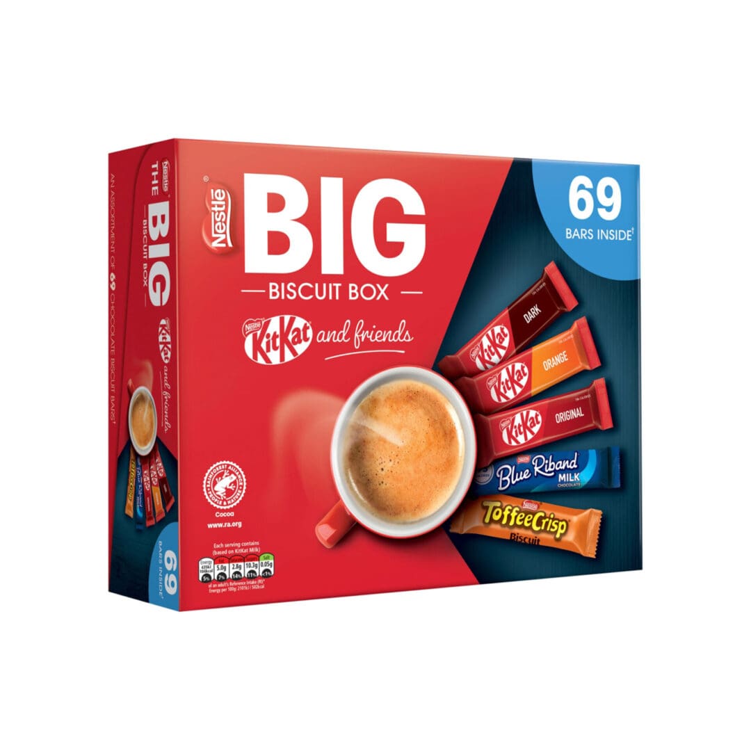 KITKAT 2 finger MILK 21x20.7g Two crispy wafer fingers covered with milk chocolate (66%) Ingredients- sugar, WHEAT flour (contains calcium, iron, thiamin and niacin) , whole MILK powder, cocoa mass, cocoa butter, vegetable fats (palm, shea, palm kernel, sal), whey powder product (MILK), skimmed MILK powder, emulsifier (lecithins), yeast, raising agent (sodium bi carbonate), glucose syrup, butterfat (MILK), whey powder (MILK), natural flavourings. Rainforest alliance certified cocoa. Find out more at ra.org KITKAT 2 finger Dark 9x20.7g T wo crispy wafer fingers covered in dark chocolate (66%). Ingredients- sugar, cocoa mass, WHEAT flour (contains calcium, iron, thiamin and niacin), vegetable fats (palm, shea, palm kernel, shea, sal ), cocoa butter, butterfat (MILK), emulsifier (lecithins), whole MILK powder, whey powder product (MILK), yeast, raising agent (sodium bicarbonate), skimmed MILK powder, glucose syrup, whey powder (MILK), natural flavourings. Rainforest alliance certified cocoa. Find out more at ra.org KITKAT 2 finger Orange 9x20.7g Two crispy wafer fingers covered in orange chocolate (66%). Ingredients- sugar, WHEAT flour (contains calcium, iron, thiamin and niacin), whole MILK powder, cocoa mass, cocoa butter, vegetable fats (palm, shea, palm kernel, sal), whey powder product (MIL K), skimmed MILK powder, emulsifier (lecithins), natural orange flavouring, yeast, raising agent (sodium bicarbonate), glucose syrup, butterfat (MILK), whey powder (MILK), natural flavourings. Rainforest alliance certified cocoa. Find out more at ra.org TOFFEE CRISP 14x18.7g Biscuit pieces, crisped cereal (14%) and caramel (20%) covered in milk chocolate. Ingredients- sugar, vegetable fats (palm, coconut, shea, sunflower), glucose-fructose syrup, WHEAT flour, whey powder product (MILK), sweetened condensed MILK (MILK, sugar), cocoa butter, rice flour, dried whole MILK, cocoa mass, fat-reduced cocoa powder, emulsifier (lecithins), salt, malted BARLEY flour, firming agent (calcium carbonate), caramelised sugar, raising agent (sodium bicarbonate), WHEAT starch, flavouring. BLUE RIBAND 16x18g Crisp wafer biscuit covered in real milk chocolate (47%). Ingredients- sugar, WHEAT flour, vegetable fats (palm, shea), cocoa