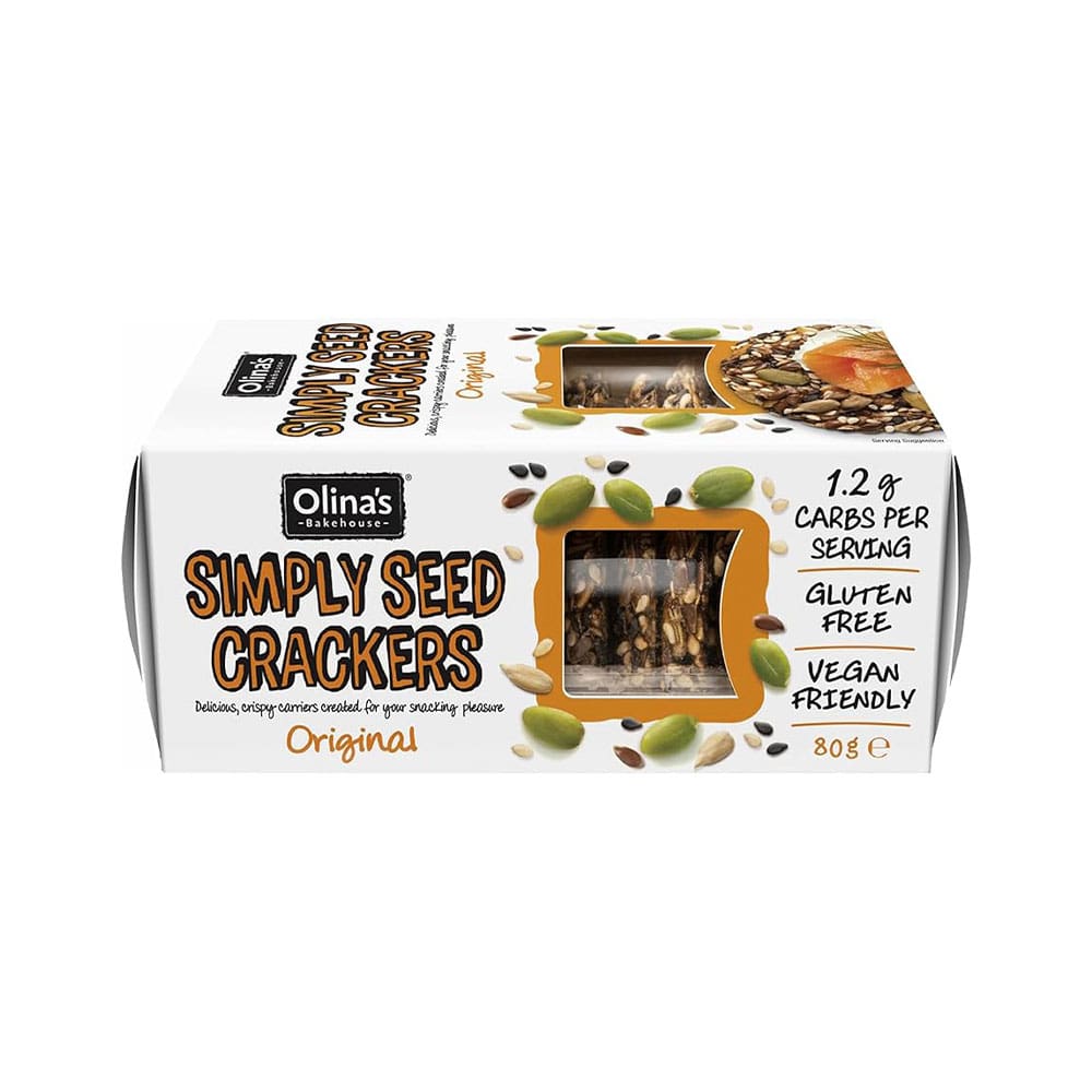 Olinas Simply Seed Crackers Original are crisp, wholesome seed crackers ideal for pairing with cheese or serving as a health-conscious snack in professional kitchens.