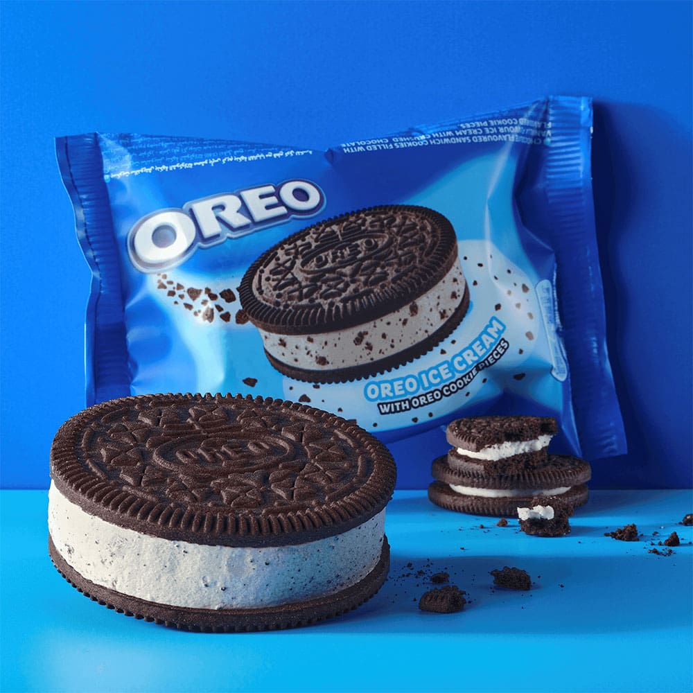 Classic Oreo Cookie Sandwich ice cream featuring creamy filling between two Oreo biscuits. Supplied in convenient 24x110ml packs, ideal for quick indulgent moments.