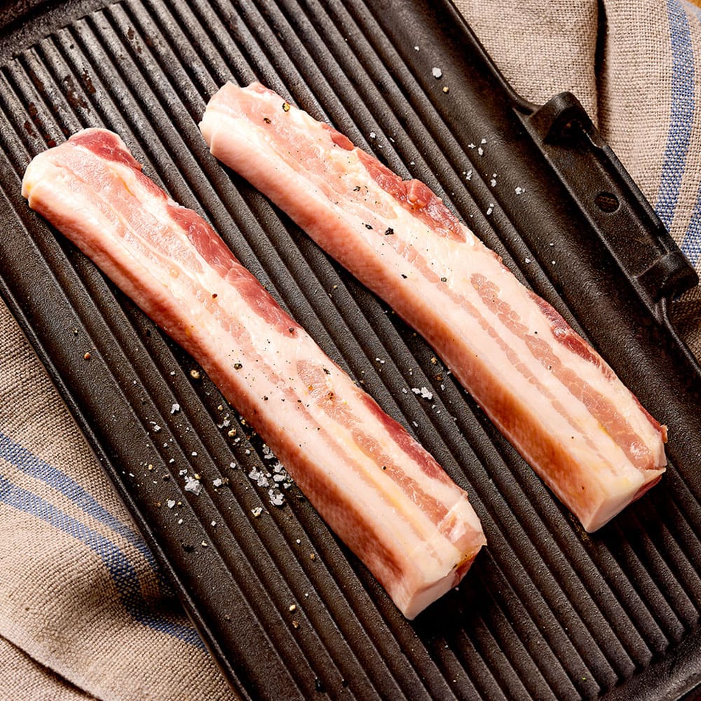 Skinless Pork Belly Strips Glasto, 1kg pack. Ideal for roasting, grilling or slow cooking to create tender, flavourful dishes with reliable quality.