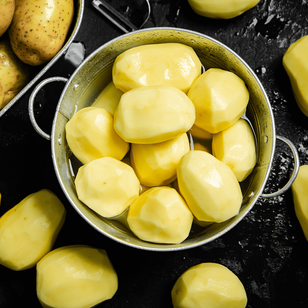 Convenient 5kg whole peeled potatoes, perfect for roasting, mashing, or cooking. Fresh, quality vegetables to streamline kitchen preparation.