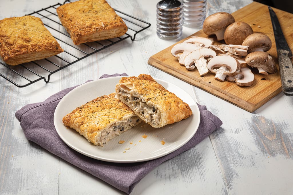 Discover the Proper Cornish Chicken and Mushroom Slice, a savoury turnover with tender chicken and diced mushrooms in creamy sauce, wrapped in flaky pastry. Supplied in 27x175g parcels, ideal for professional kitchens.
