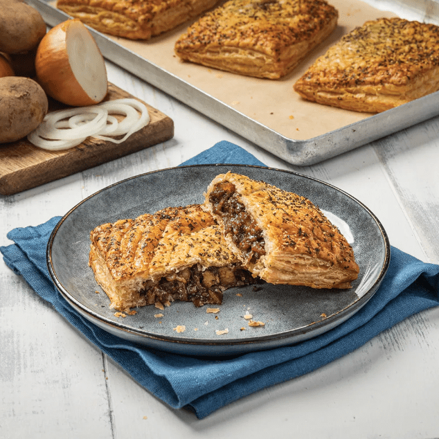 Proper Cornish Steak Slice features tender steak in flaky pastry, perfect for a hearty snack. Delivered in 27x175g parcels, ideal for menus or retail.
