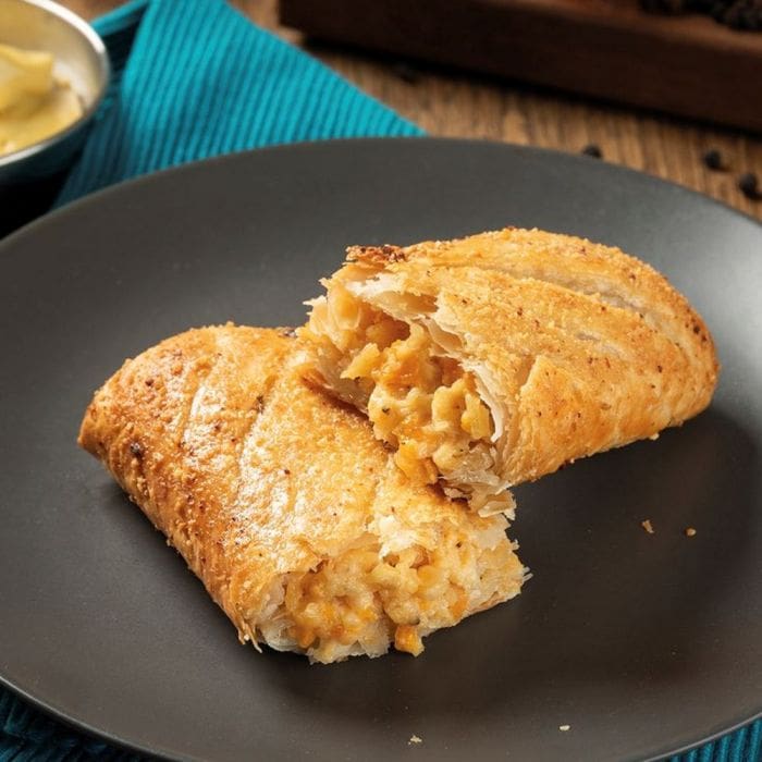 Proper Cornish Cheese and Onion Rolls, 144g each, offering rich flavour in flaky pastry. Perfect for cafés and catering. Bake fresh for best taste.