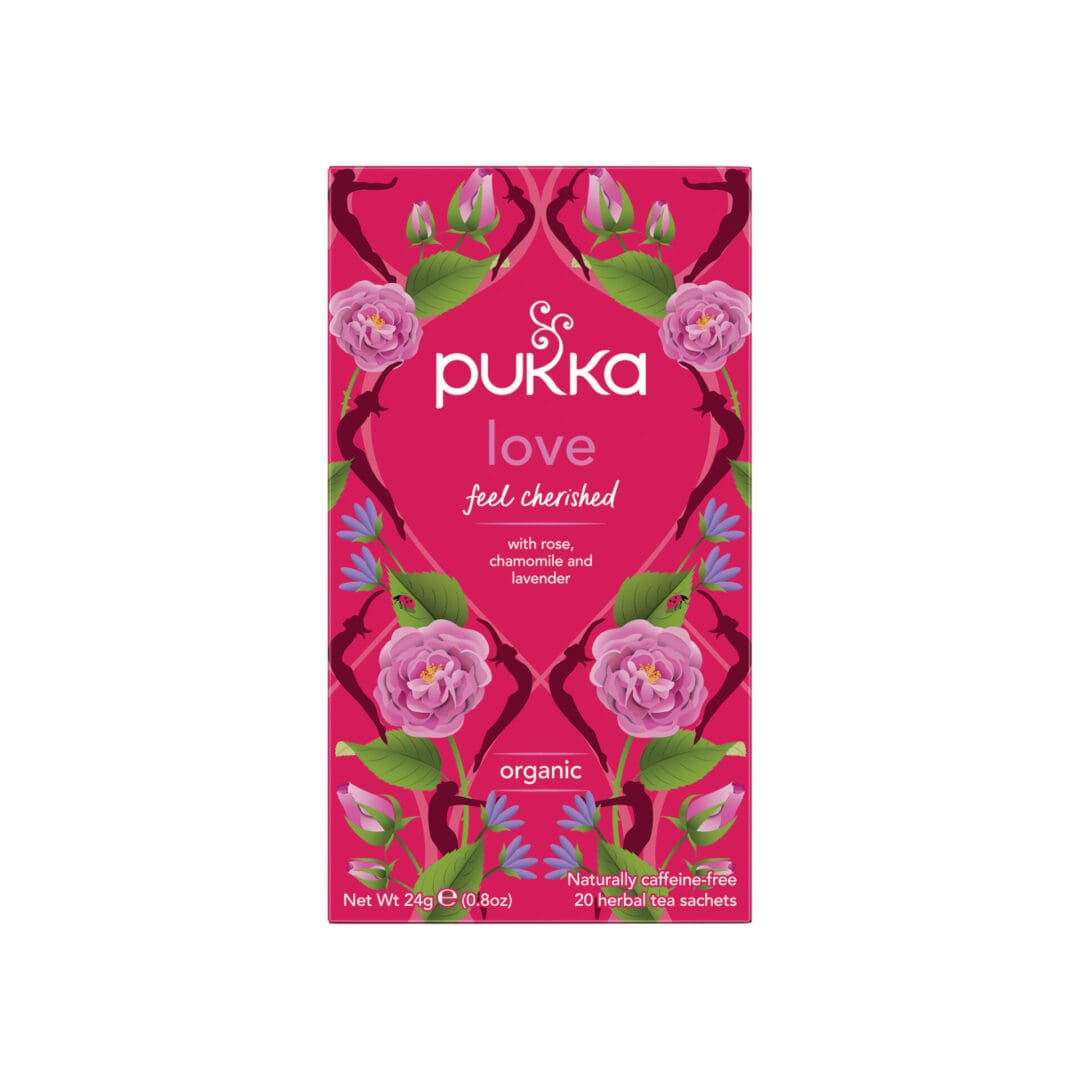 Pukka Organic Love Rose & Chamomile Tea blends organic rose and chamomile for a soothing, caffeine-free drink. Available in 4×20 bags.