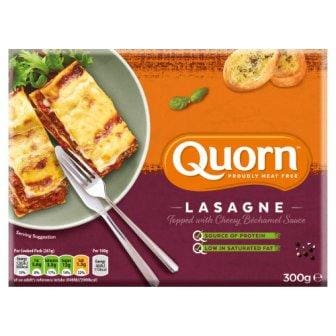 Quorn Lasagne features meat-free mince combined with pasta, creamy bechamel and a cheddar cheese topping, providing a tasty, convenient meal option in 300g portions.