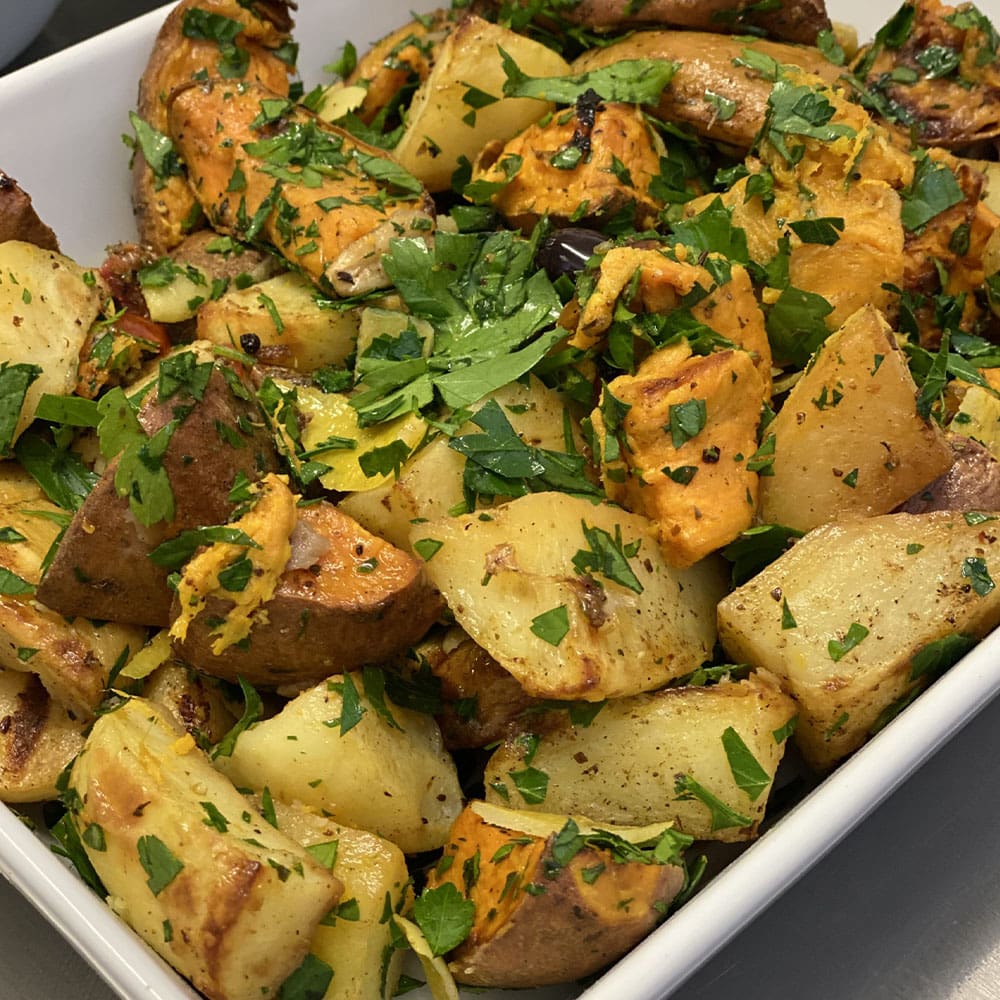 Ready Roots Serves 2 is a seasoned roasted mix of sweet potato, celeriac, butternut squash, carrot, and red onion in turmeric and coconut oil, perfect for quick meal sides.