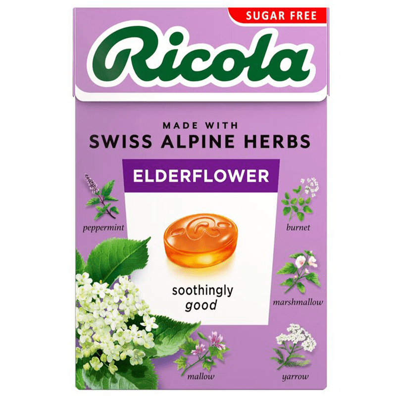 Sweetener (Isomalt), Acid (Malic Acid), Extracts (0.5%) of Elderflowers and Ricola's Herb Mixture, Concentrated Lemon Juice, Sweetener (Steviol Glycosides from Stevia), Natural Flavourings, Concentrate (Sweet Potato, Carrot), Menthol