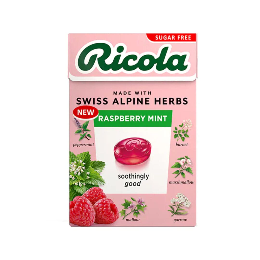 Sweetener (Isomalt) Acids (Citric Acid, Malic Acid) Concentrated Raspberry Juice (0.6%) Extracts (0.5%) of Lemon Balm and Ricola's Herb Mixture Natural Flavourings Concentrate (Sweet Potato, Carrot) Sweetener (Steviol Glycosides from Stevia) Peppermint Oil Mint Oil Menthol